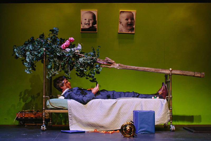Cela correspond au moment où, dans Extase et Quotidien, le jeune quadragénaire Janne, qui s’accroche désespérément à son enfance par peur de souffrir depuis le début de la pièce, va enfin parvenir à devenir adulte. Mais ce sera au prix du sacrifice de son monde intérieur, auquel il va totalement renoncer pour se réfugier dans une normalité décérébrée. Nul doute que Rebekka Kricheldorf ne croit pas à la valeur de cette mutation, qui ne consiste pour Janne qu’à embrasser davantage la société de consommation en s’achetant des meubles préfabriqués et en réservant des vols « low cost » sur Internet.