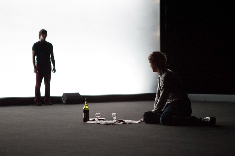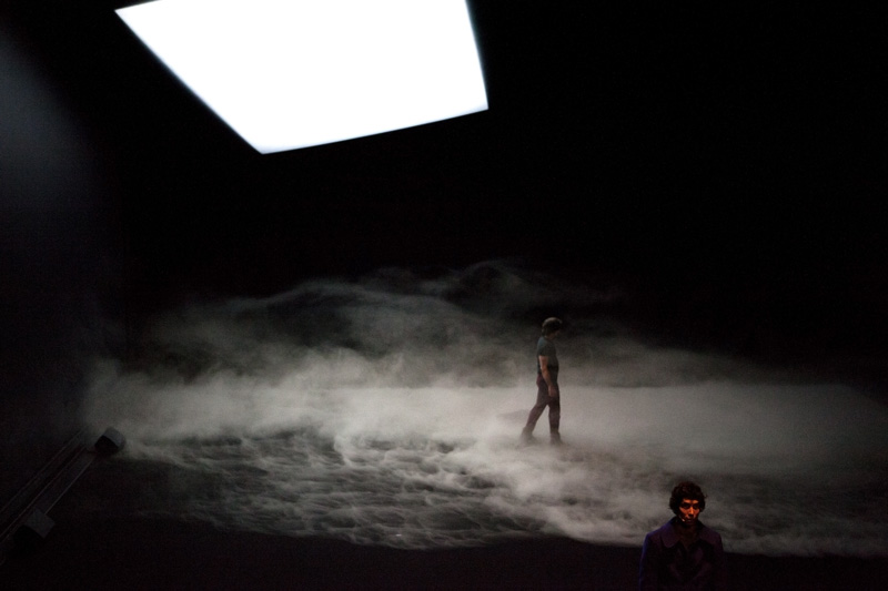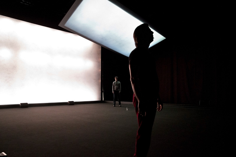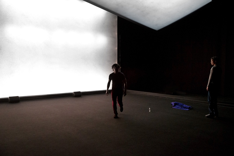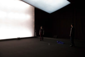 Avec Sylvie Kleiber, nous avons conçu une scénographie sans contour. Un décor sans bords. Mais les corps des personnages non plus n’ont pas de bords. Ni d’identité. L’identité de l’Un se place peut-être dans la continuité de celle de l’Autre. Peut-être ne sont-ils que les deux hémisphères d’un même corps. Ou peut-être leur corps trouve-t-il, ou espère-t-il trouver, un prolongement dans l’espace, en se fondant en lui. Peut-être que leur peau, qui les sépare d’avec l’air avoisinant, et leurs muscles, leurs os, qui se mesurent au monde concret, cherchent, comme un enfant qui explore le monde, les limites. Les limites entre soi et le monde, les limites entre soi et l’autre. Peut-être les corps se battent-ils constamment avec ce qui englobe leurs os, leurs muscles. Peut-être cherchent-ils désespérément un prolongement d’eux-mêmes dans l’oxygène…