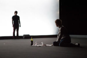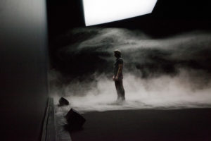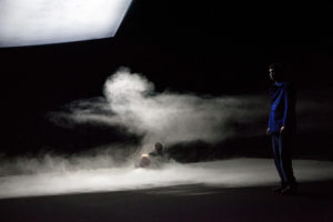 Ce qui s’exprime dans Je suis le vent est à la fois très simple et très compliqué. Comme tous les grands dramaturges, Jon Fosse cherche à exprimer quelque chose qui ne peut se dire qu’à travers le théâtre. C’est la représentation de la pièce, à travers des acteurs et devant un public, qui permet de faire entendre ce qu’il y a à exprimer. Cela ne peut se formuler dans un résumé ou à travers un article de journal ; cela ne peut se transmettre qu’à travers une expérience intellectuelle, sensuelle et collective. Jon Fosse a commencé sa carrière d’auteur en écrivant des essais et des textes théoriques. Puis il y a totalement renoncé, pour se consacrer exclusivement au genre théâtral et au roman. Ce qu’il cherche à rendre visible, à rendre sensible, se trouve dans un endroit très particulier. Cela se trouve « entre ». Cela ne se trouve pas dans les mots, pas dans les phrases, ni même dans l’intensité de l’interprétation d’un acteur ou dans la justesse de son geste. Cela ne se trouve pas dans les silences, très nombreux dans toutes les pièces de Jon Fosse. Cela se trouve « entre ». Entre l’acteur et son rôle, entre les mots et leurs sens, entre les corps et le vide autour d’eux, entre leur présence et leur absence. Cela ne se trouve ni dans la bouche des acteurs, ni dans la tête des spectateurs. Cela ne se trouve ni sur le plateau, ni dans les gradins, cela se trouve « entre ».